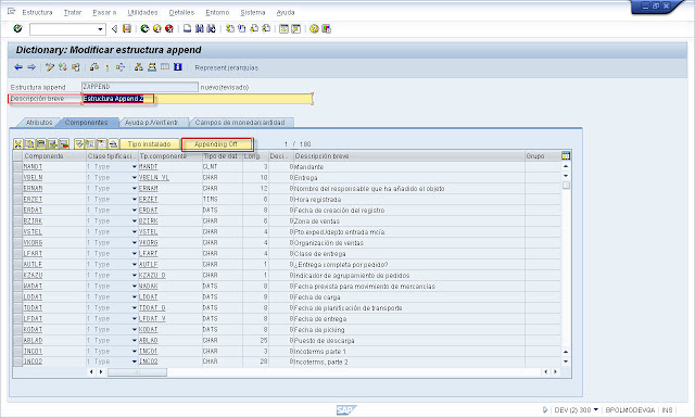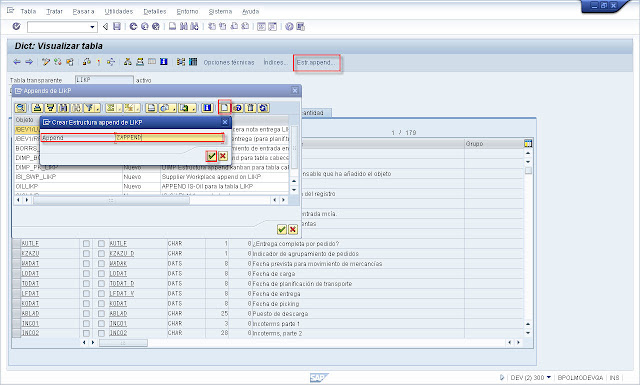 Ingresamos a la tabla LIKP mediante la transacción SE11, clic en Estr. Append, seleccionamos el icono de crear e ingresamos en la siguiente pantalla